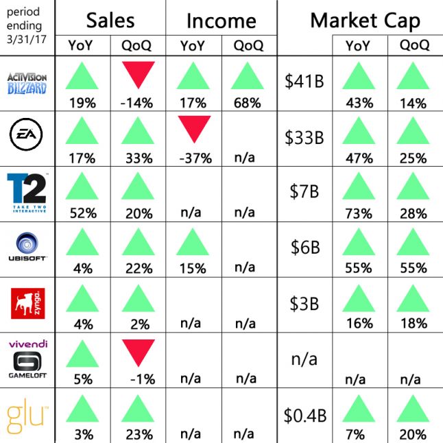 One key trend to note in this period – the three months from 1 January to 31 March 2017 – is that all Western game companies experienced growth in their share price, both on a YoY and QoQ basis. If nothing else, it was a good quarter to be an investor.
