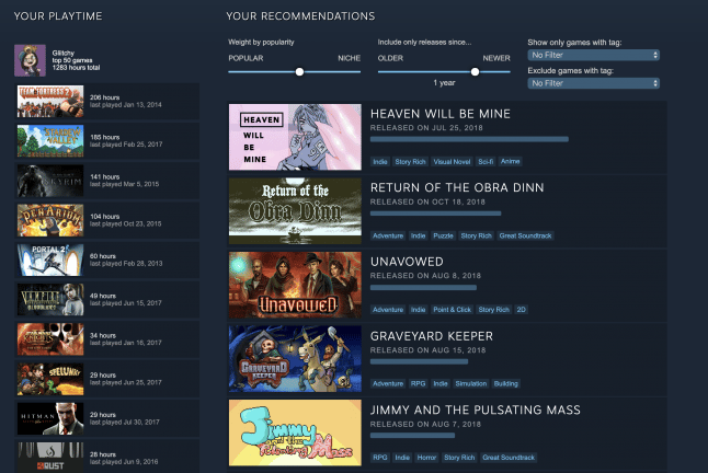 The new feature itself looks at previous play history and patterns to churn out a list of recommendations right away, but Steam users have the option to apply filters based on tags, display only new or old releases, and weigh recommended titles according to how popular or niche Steam considers them.
